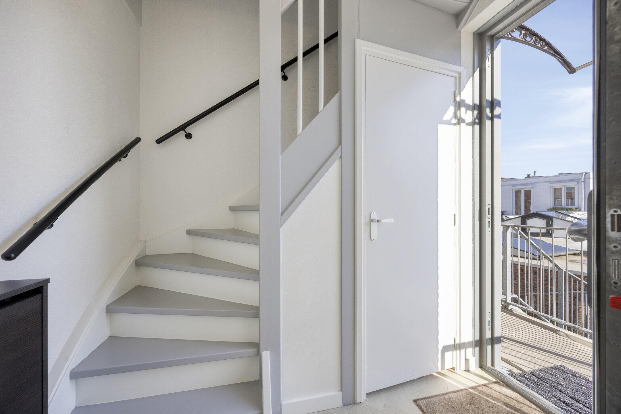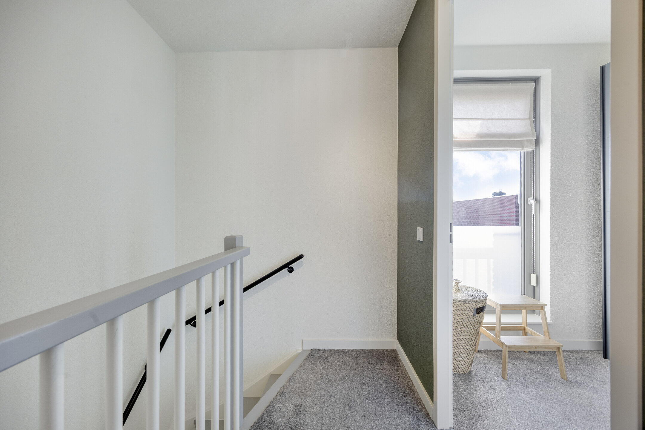 Je komt binnen in een lichte en verzorgde hal met strak afgewerkte wanden en een stijlvolle visgraat PVC-vloer die meteen een moderne indruk geeft. In de hal vind je de trapopgang naar de eerste verdieping en een praktische kast voor extra opbergruimte. Vanuit hier heb je toegang tot de woonkamer en keuken.