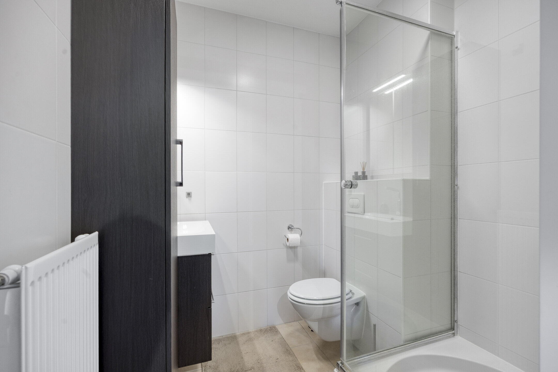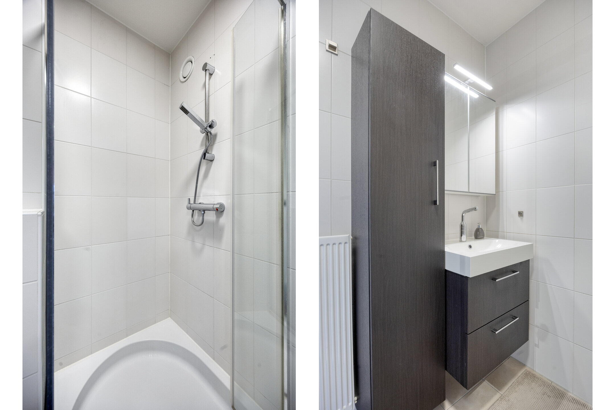 De badkamer is fris en verzorgd en voorzien van een wasmeubel, douche, toilet en een handige kast voor extra opbergruimte.