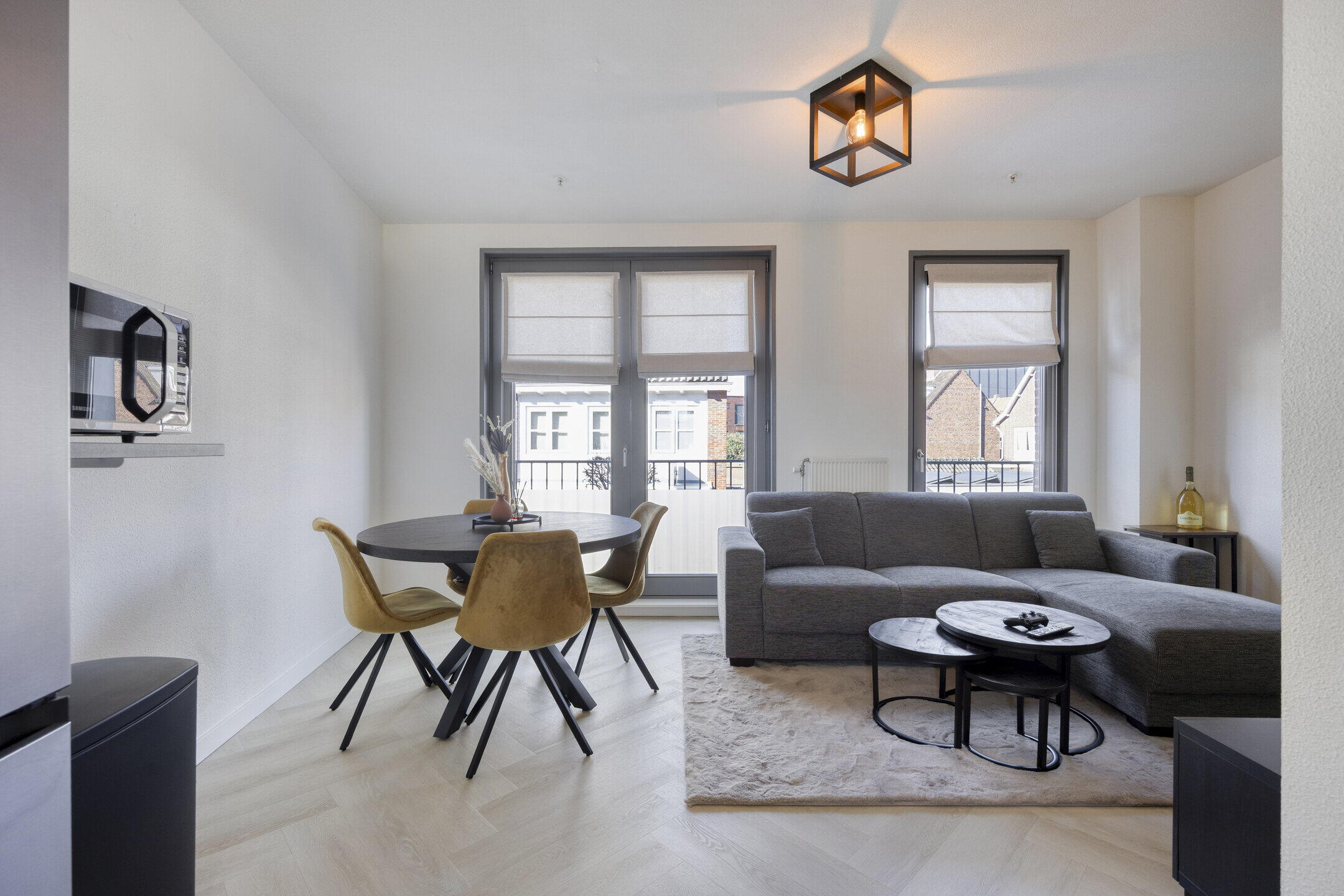 De woonkamer voelt modern en sfeervol aan dankzij de strakke afwerking en de doorlopende visgraat PVC-vloer. Er is volop ruimte voor een comfortabele hoekbank en een gezellige eethoek waar je met vrienden of familie kunt tafelen. Het Franse balkon zorgt voor extra lichtinval en een fijne, open sfeer.